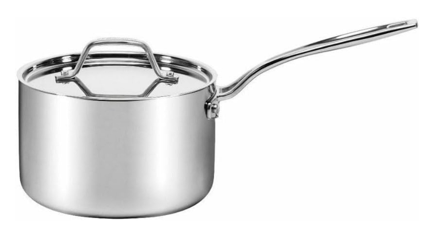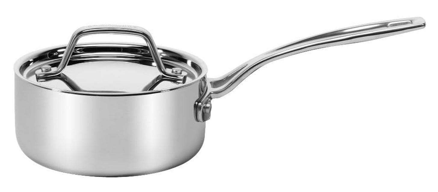 Cuisinart Custom Clad 5-Ply Stainless Steel 1 Qt. Saucepan with Lid. This little pan is perfect for making small quantities of sauce when plating up food. It will be practical to have around for boiling eggs, making rice for two people, or some ramen on the fly. Compatible with all cooktops.