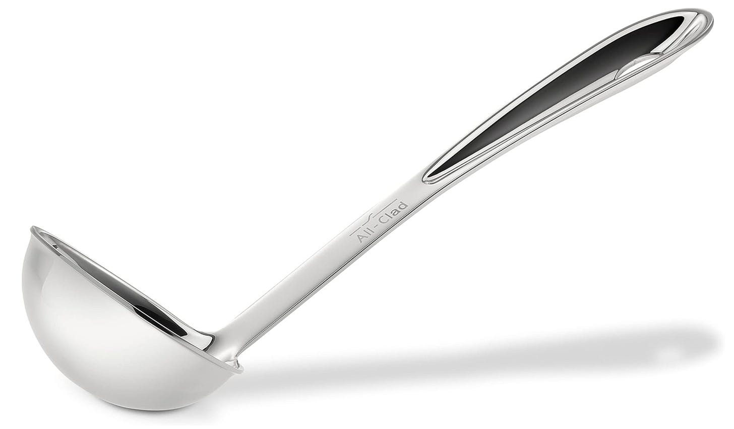 All-Clad Stainless Steel Ladle. Soup anyone? How else are you going to get it from the pot to your bowl? Rating this a must have.