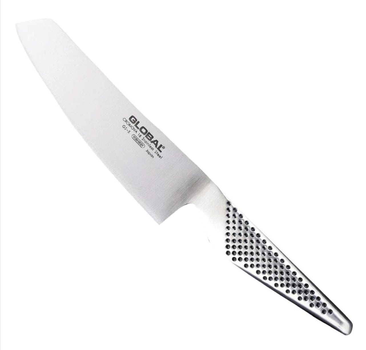 Global 5.5 inch stainless steal vegetable knife. This Japanese knife company makes high quality knives out of high-tech molybdenum/vanadium stainless steel for very affordable prices. The blade is thicker and quite a bit shorter than the Arcos chef knife, so it’s not suited to chopping larger vegetables. But it’s very ergonomic, feels so comfortable in my hand, never causes blisters even when I’m chopping away like mad. I use it for dicing and chopping anything that doesn’t require a larger, thinner blade. When it’s nice and sharp it does an excellent job of slicing tomatoes. No serrated blade needed to cut through that touch, snag-prone skin. This is my all around favorite knife.