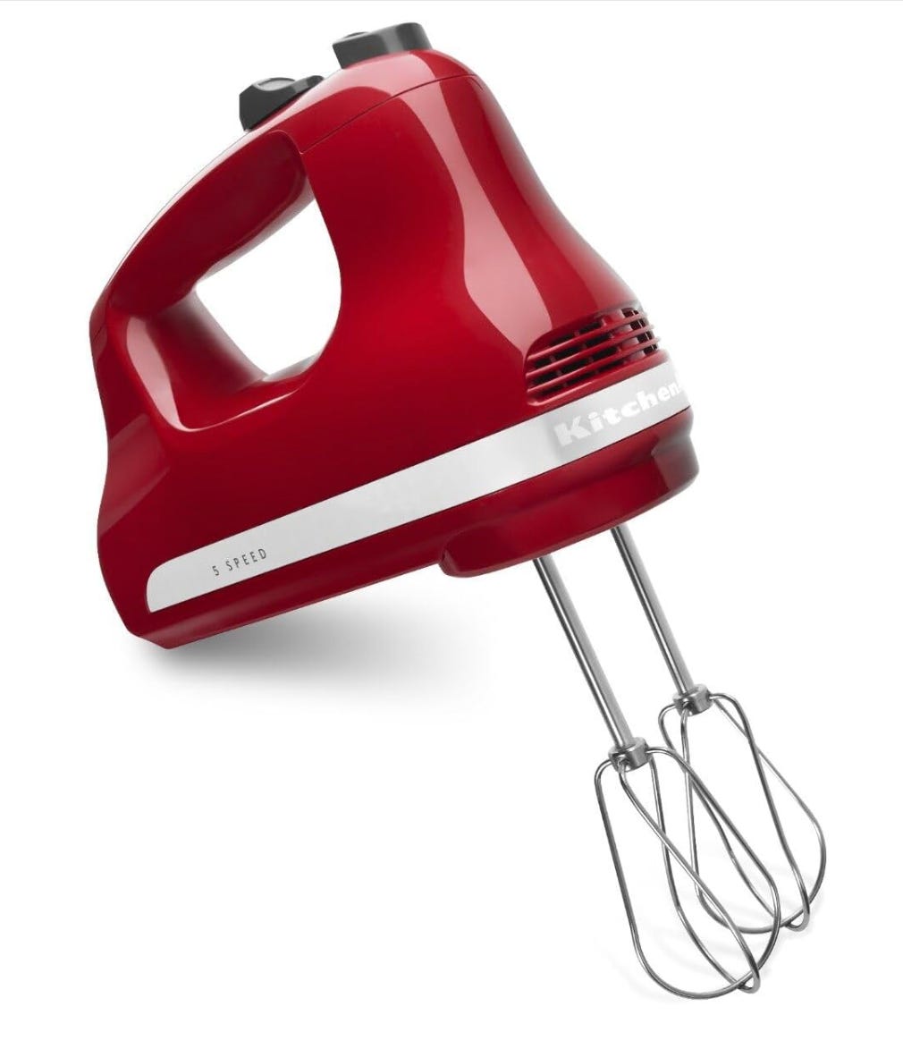 KitchenAid 5 Ultra Power Speed Hand Mixer. Unless you’re going to be doing some serious pastry production, don’t bother with a fancy stand-alone mixer. You’re really only going to be using this for beating eggs, whipped cream, pancake mix, that type of thing. A simple hand mixer will do. Kitchen Aid is a reliable brand, plus they have a ton of cool colors.