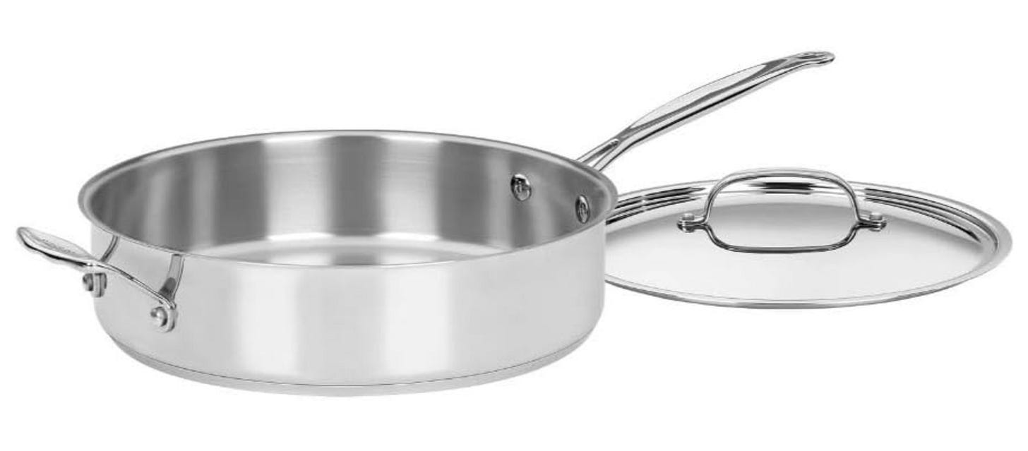 Cuisinart Stainless Steel 5.5 Quart Deep Sauté Pan with Lid. A deep sauté pan is really useful for browning meats, and then braising them over low heat. Having those high edges not only keeps your cooktop cleaner, it retains heat in the pan unlike a shallow fry pan, and it allows you to add enough liquids to cover chicken thighs for example. You can also make large quantities of sauce and vegetables for larger families or dinner parties. It’s good to have both types of frying pans. If you’re on a budget Cuisinart is a reliable brand. Compatible with all cooktops.