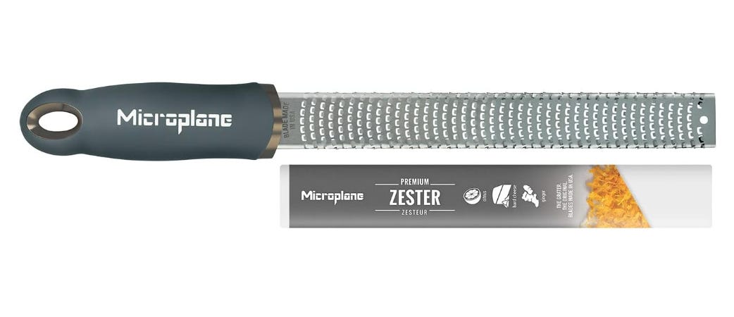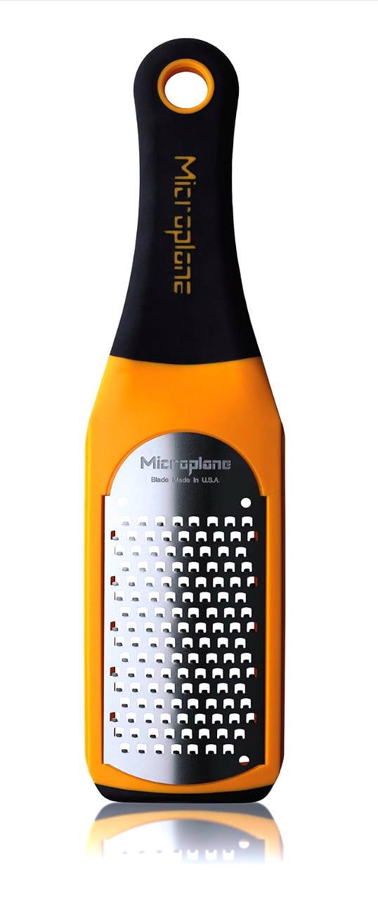 Microplane premium zester grater. This grater will not replace a regular cheese grater, unless you want to spend a couple hours grating cheddar for your famous crowd-pleasing home-baked macaroni and cheese. It’s an awesome tool for topping dishes with fine citrus zest, or ultra thin shavings of parmesan that melt on contact. You can also use it to grate nutmeg. Forget about investing in a garlic press. Those things are useless. If you want to make a fine ginger garlic paste for your Indian dishes, use the microplane instead. It’s very versatile and well worth the investment to up your game a bit.