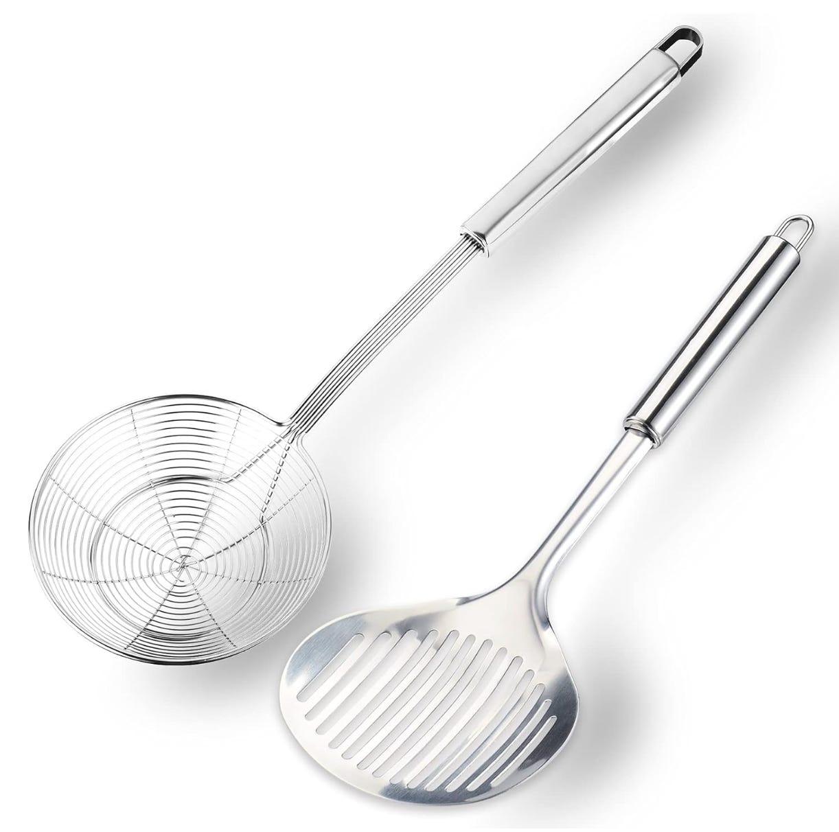 TENTA Stainless Steel Cooking Skimmer Slotted Spoon and Spider Strainer. Essential if you’re going to be doing any frying for pulling food out of piping hot oil and on to some absorbent paper. These are also handy tools for straining vegetables or noodles out of boiling water. Plus they look cool hanging on your wall.